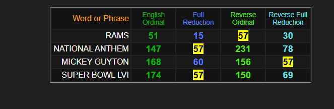 WHAT ARE THE ODDS THAT THIS RITUAL COULD BE SPOKEN IN GEMATRIA WITH ONE NUMBER …57. GUYTON SINGS NATIONAL ANTHEM FOR SUPERBOWL LVI AT RAMS STADIUM… PERFECTLY SCRIPTED EVERYTIME.