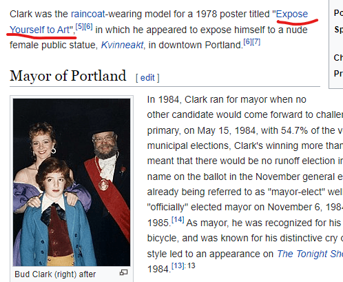 Clark was the raincoat-wearing model for a 1978 poster titled “Expose Yourself to Art“,[5][6] in which he appeared to expose himself to a nude female public statue, Kvinneakt, in downtown Portland.[6][7]