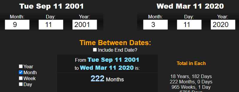 FROM 9/11/01 TO 3/11/20 WAS 222 MONTHS