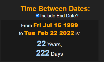February 25, 2022 222, JFK JR COINCIDENCE. JFK JR DIED IN A HELICOPTER CRASH JULY 16, 1999 22 YEARS AND 222 DAYS BEFORE 2/22/22 GIVE KNOWLEDGE AND SHARE THIS! Click to share on Facebook (Opens in new window) Facebook Click to share on Telegram (Opens in new window) Telegram Click to share on X (Opens in new window) X Like Loading... Related