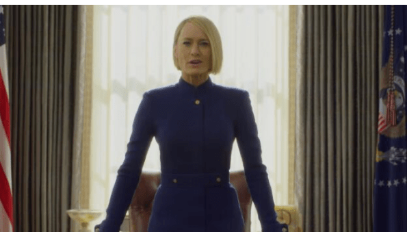 THEN HOLLYWOOD GAVE US ‘HOUSE OF CARDS’ A SERIES WHERE WE HAVE THE FIRST FEMALE. SHE BECOMES PRESIDENT DUE TO THE PRESIDENT BEING TO SICK TO STAY IN OFFICE…