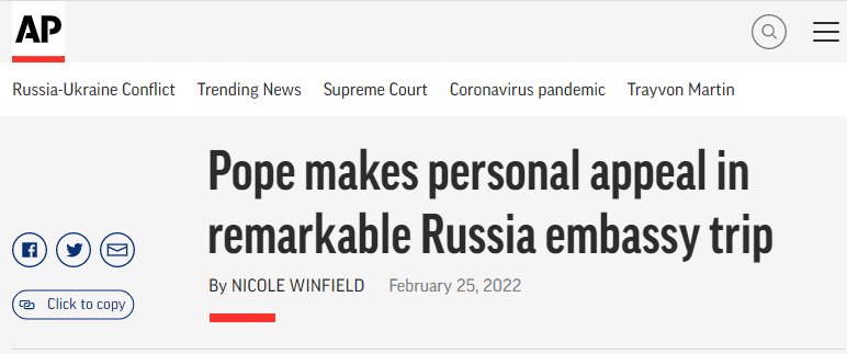 February 27, 2022February 27, 2022 THE POPE IN THE HEADLINES ON THE 56 DAY OF THE YEAR. 2/25/22 THE POPE MAKES HIS PLEA ON THE 25TH OF FEB THE 56TH DAY OF THE YEAR. IT IS A BIBLICAL WAR SCRIPTED LONG AGO. GIVE KNOWLEDGE AND SHARE THIS! Click to share on Facebook (Opens in new window) Facebook Click to share on Telegram (Opens in new window) Telegram Click to share on X (Opens in new window) X Like Loading... Related