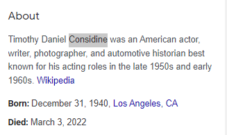 AND HE JUST HAPPENS TO DIE IN 2022, 22 WEEKS AND 2 DAYS AFTER THE ANNIVERSARY OF HIS LAST EPISODE ON 9/29/1960