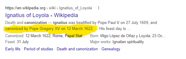 March 13, 2022 3/12/22, 400 YEAR ANNIVERSARY OF SAINT IGNATIUS OF LOYOLA CANONIZATION. 12/3 HE WAS CANONIZED AND THIS IS WHY GIVE KNOWLEDGE AND SHARE THIS! Click to share on Facebook (Opens in new window) Facebook Click to share on Telegram (Opens in new window) Telegram Click to share on X (Opens in new window) X Like Loading... Related