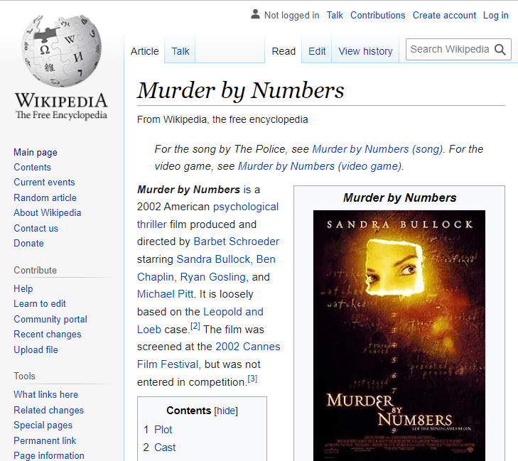 Most people went and seen a movie back in 2002. MURDER BY NUMBERS starring SANDRA BULLOCK.
