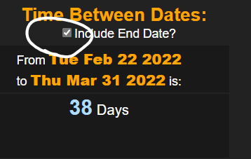 IF YOU COUNT THE END DATE YOU GET 38 DAYS TO TODAY AND YESTERDAY