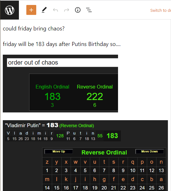 April 8, 2022April 8, 2022 missile strike 183 days as predicted here is what i said in the blog post linked below we got 52 hurt at the train station from a missile strike https://cracktheircode.org/2022/04/06/181-days-after-putins-birthdya-and-on-the-42nd-day-of-the-war-putins-daughters-make-headlines-for-being-sanctioned/ GIVE KNOWLEDGE AND SHARE THIS! Click to share on Facebook (Opens in new window) Facebook Click to share on Telegram (Opens in new window) Telegram Click to share on X (Opens in new window) X Like Loading... Related