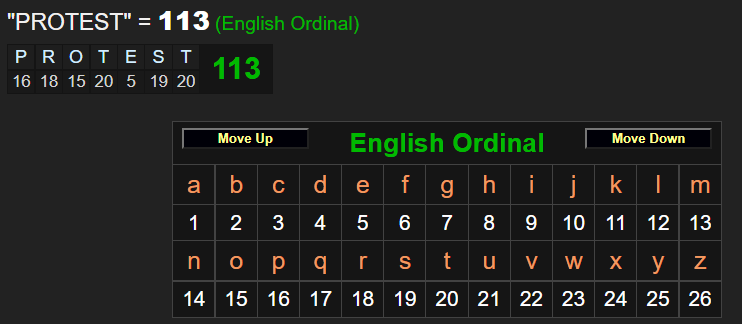 WE KNOW THE BULLSHIT NUMBER IS 113 AND PROTEST FITS RIGHT IN THE NUMERIC PATTERN