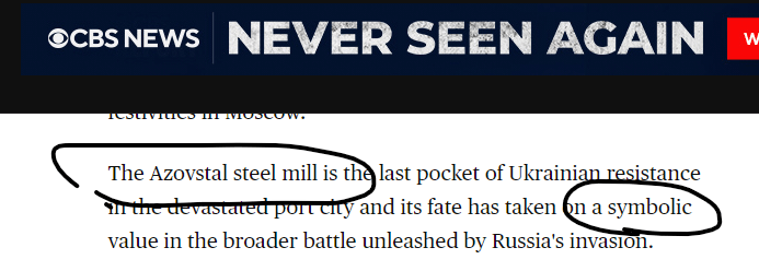 May 7, 2022 AZOVSTAL STEEL MILL IN THE HEADLINES ON 5/7/22 223/322 THESE PLACES ARE CHOSEN PLACES OF DESTRUCTION ON THE WORLD STAGE GIVE KNOWLEDGE AND SHARE THIS! Click to share on Facebook (Opens in new window) Facebook Click to share on Telegram (Opens in new window) Telegram Click to share on X (Opens in new window) X Like Loading... Related