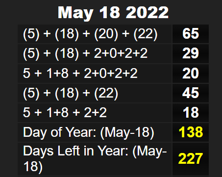 MAY 18TH IS THE 138TH DAY AND IT LEAVES 227 DAYS LEFT