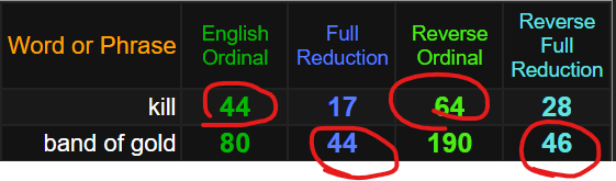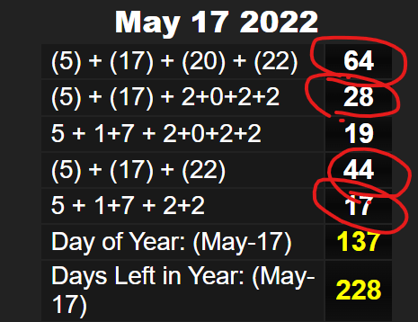 notice kill and the date numerology is the same. hence why it is called the Kill date. One day a month the date numerology will be 64, 28, 17, 44 and we always see death in the headlines.