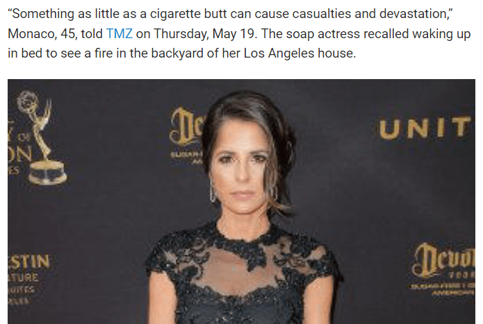 Kelly Monaco “recalled waking up in bed to see a fire in the backyard of her Los Angeles house.” What did she have to look through to see her backyard en fuego? Her rear window.