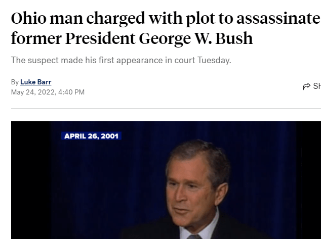One thought on “MAY 24, THE 144TH DAY OF THE YEAR. oHIO MAN IS ARRESTED AND CHARGED WITH PLOT TO KILL GEORGE W BUSH.”
