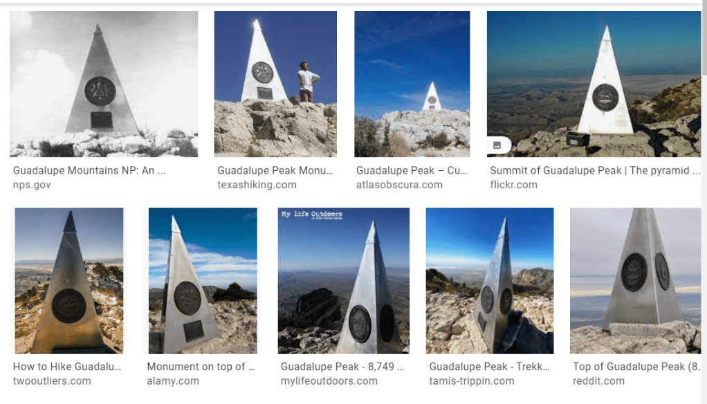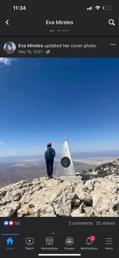 ON MAY 15 2021, EVA POSTED THIS PICTURE BESIDE A PYRAMID SHAPED MONUMENT AT GUADALUPE PEAK.