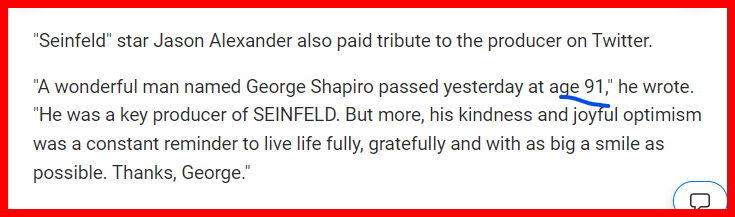 SHAPIRO IS DEAD AT AGE 91, 41 DAYS BEFORE THE ANNIVERSARY OF THE RELEASE OF SEINFELD