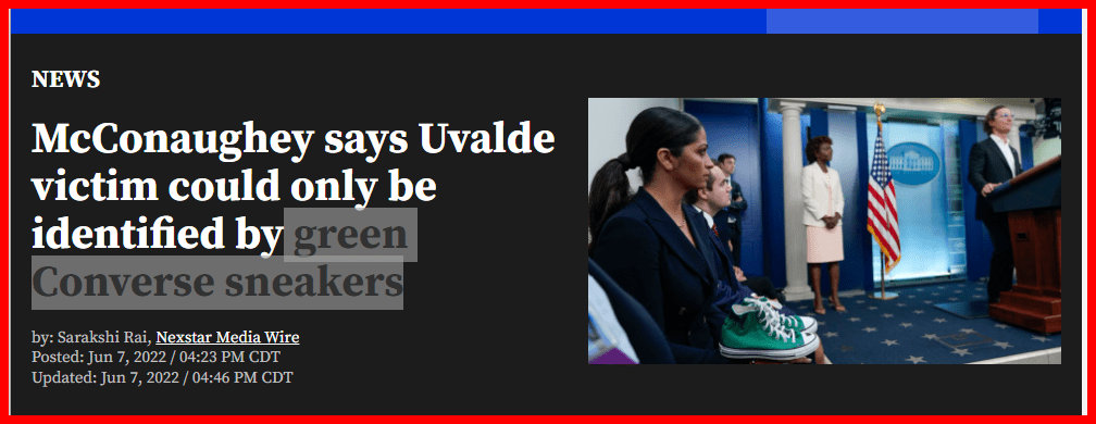 no blood? no damage? no dirt? but they came off a child who was shot to death and only identifiable with these squeaky-clean green converses.