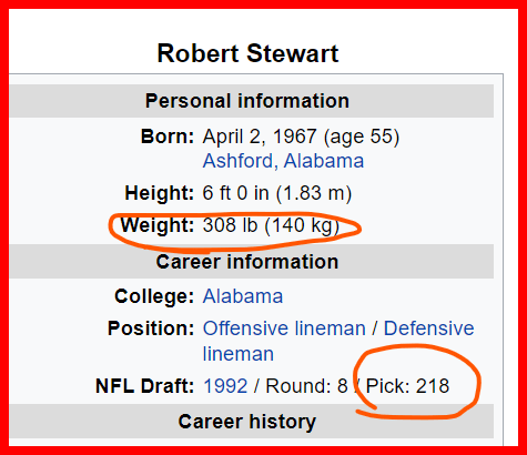 if you look at his Wikipedia page for his pick count and his weight you get 308 lb and pick 218