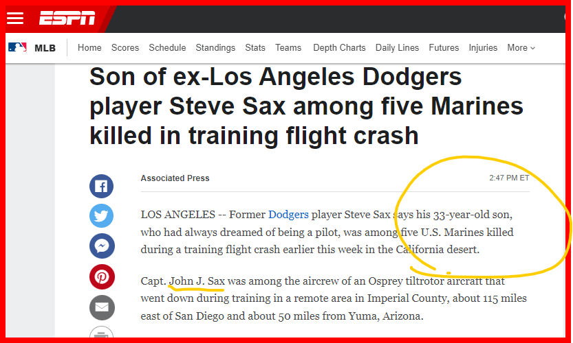 Headlines of the History books tells us that Steve Sax’s son was on the aircraft that crashed.