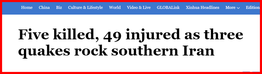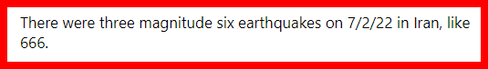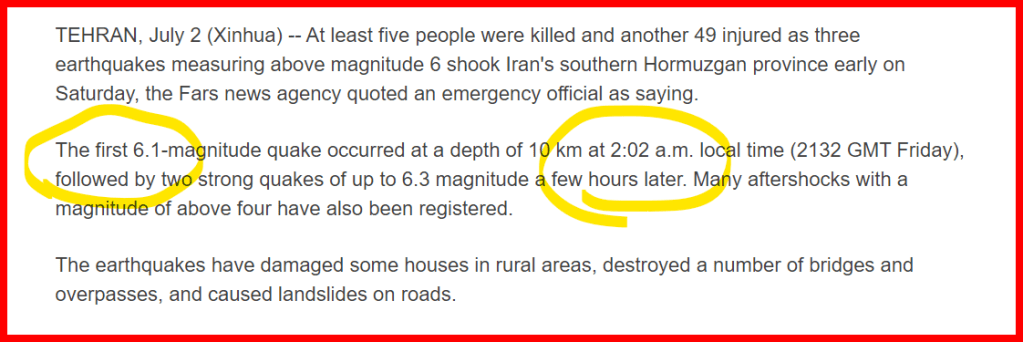 July 2, 2022 THREE EARTHQUAKES IN IRAN MAGNITUDE OF 6 LIKE 6,6,6. WEATHER MODIFICATION? THE FIRST QUAKE HAPPENS AT 2:02 GIVE KNOWLEDGE AND SHARE THIS! Click to share on Facebook (Opens in new window) Facebook Click to share on Telegram (Opens in new window) Telegram Click to share on X (Opens in new window) X Like Loading... Related