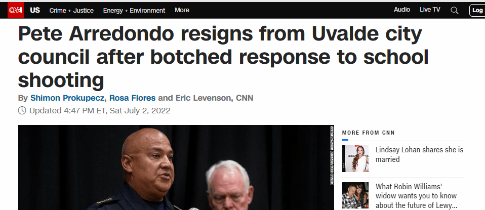 July 2, 2022 UVALDE SCHOOL POLICE CHIEF RESIGNS. HEADLINE NEWS ON 7/2 GIVE KNOWLEDGE AND SHARE THIS! Click to share on Facebook (Opens in new window) Facebook Click to share on Telegram (Opens in new window) Telegram Click to share on X (Opens in new window) X Like Loading... Related