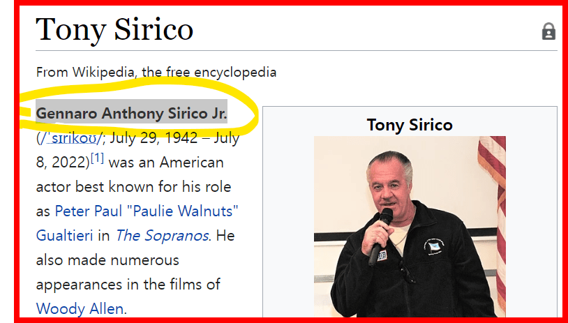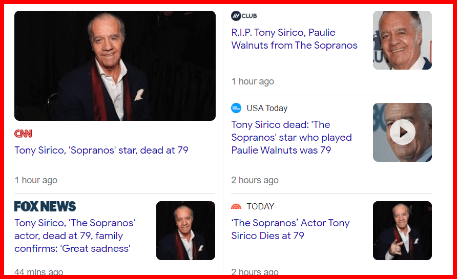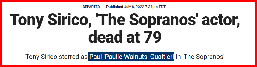 July 8, 2022July 8, 2022 Tony Sirico, ‘The Sopranos’ actor, dead at 79 DEAD AT AGE 79 SACRIFICED? dead in 2022 22 days before his birthday AND THE SKULL AND BONES STRIKES AGAIN DEAD ON 7/8 GIVE KNOWLEDGE AND SHARE THIS! Click to share on Facebook (Opens in new window) Facebook Click to share on Telegram (Opens in new window) Telegram Click to share on X (Opens in new window) X Like Loading... Related