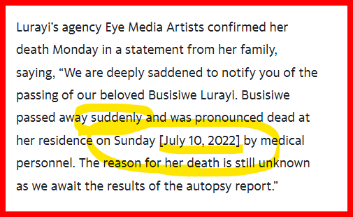 HER HEADLINE OF HER DEATH CAME ON 11TH OF JULY, 47 DAYS AFTER HER BIRTHDAY