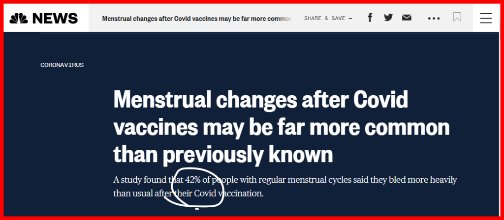 July 15, 2022 ANOTHER 42 AND VACCINE 42 PERCENT OF WOMEN HAVE MENSTRUAL ISSUES AFTER COVID VACCINE GIVE KNOWLEDGE AND SHARE THIS! Click to share on Facebook (Opens in new window) Facebook Click to share on Telegram (Opens in new window) Telegram Click to share on X (Opens in new window) X Like Loading... Related