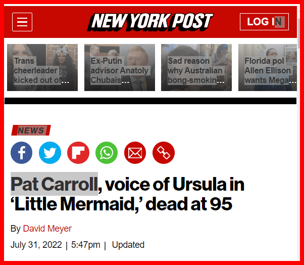 August 1, 2022August 1, 2022 86’D URSULA, PAT CARROLL, DEAD AT AGE 95 IN A SACRIFICE HEADLINE . GIVE KNOWLEDGE AND SHARE THIS! Click to share on Facebook (Opens in new window) Facebook Click to share on Telegram (Opens in new window) Telegram Click to share on X (Opens in new window) X Like Loading... Related