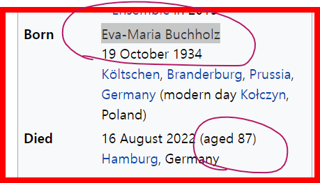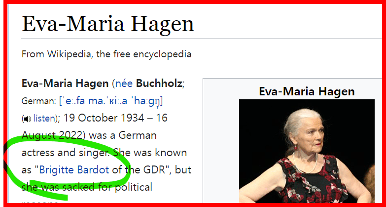 August 19, 2022 EVA MARIA HAGEN, She was known as “Brigitte Bardot of the GDR, sacrificed at age 87 on the 228th day of the year. GIVE KNOWLEDGE AND SHARE THIS! Click to share on Facebook (Opens in new window) Facebook Click to share on Telegram (Opens in new window) Telegram Click to share on X (Opens in new window) X Like Loading... Related