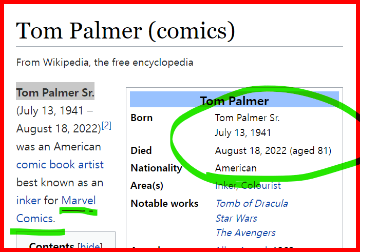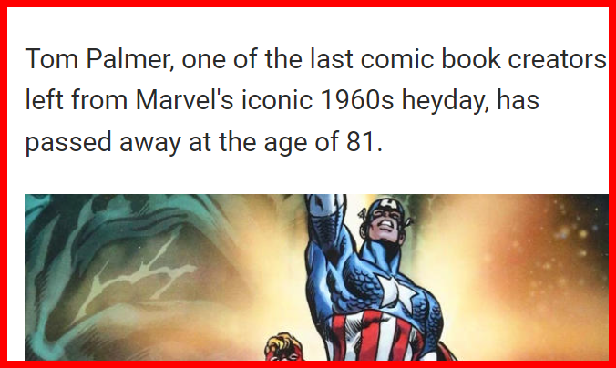 August 20, 2022 Tom Palmer, Marvel comic book creator, dead at 81 on 18/8. another ritual? Dead at age 81 dead 37 days after his birthday. Died Aug 18th, (18/8). GIVE KNOWLEDGE AND SHARE THIS! Share on Facebook (Opens in new window) Facebook Share on Telegram (Opens in new window) Telegram Share on X (Opens in new window) X Like Loading... Related