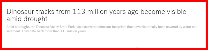 August 24, 2022August 24, 2022 DINOSAUR TRACKS, UNDER WATER, ARE STILL DETECTABLE AFTER 113 YEARS? CLIMATE CHANGE AGENDA AND BULLSHIT NEWS 113 YEARS GIVE KNOWLEDGE AND SHARE THIS! Share on Facebook (Opens in new window) Facebook Share on Telegram (Opens in new window) Telegram Share on X (Opens in new window) X Like Loading... Related