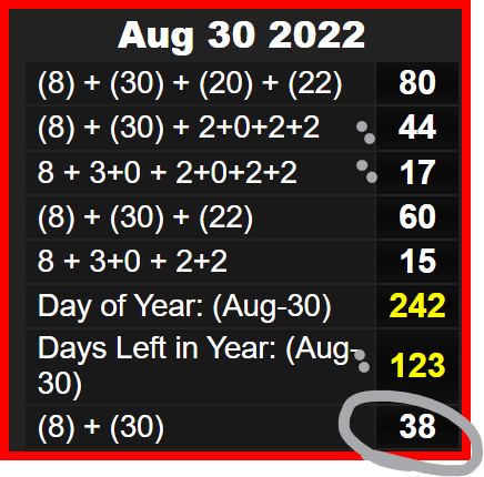 August 29, 2022 Will Aug 30 bring death and conspiracy? 8/30, In numerology you drop the 0 so 83 or 38 Aug 30th leaves 123 days left in the year GIVE KNOWLEDGE AND SHARE THIS! Click to share on Facebook (Opens in new window) Facebook Click to share on Telegram (Opens in new window) Telegram Click to share on X (Opens in new window) X Like Loading... Related