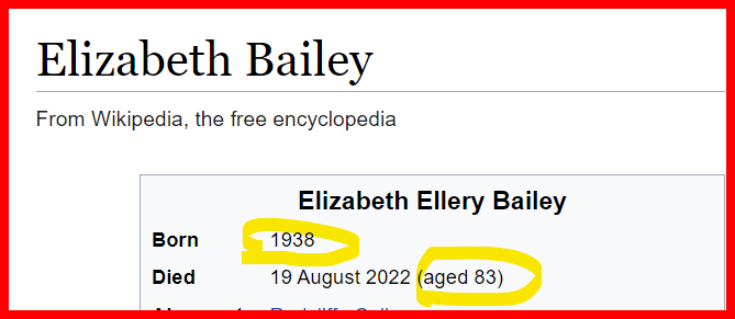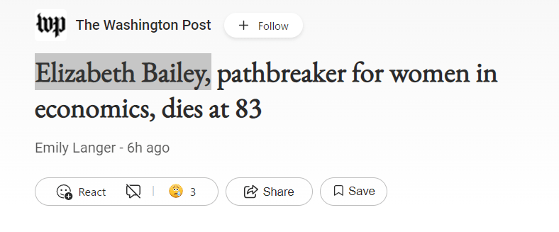 August 31, 2022 Elizabeth Bailey, pathbreaker for women in economics, dies at 83 Born in 1938 dead at age 83 exactly 38 weeks after her Birthday GIVE KNOWLEDGE AND SHARE THIS! Click to share on Facebook (Opens in new window) Facebook Click to share on Telegram (Opens in new window) Telegram Click to share on X (Opens in new window) X Like Loading... Related