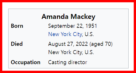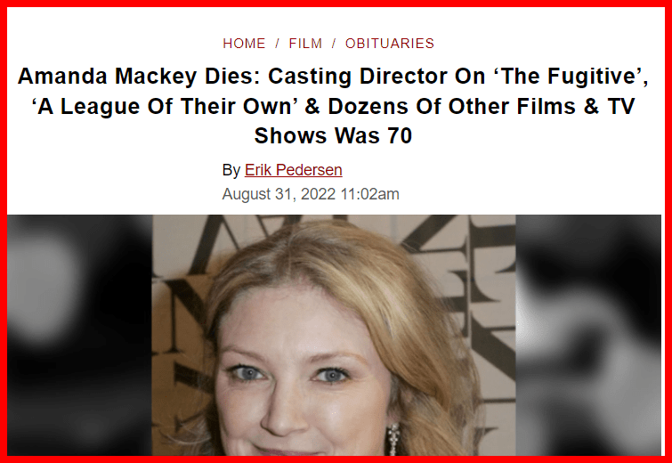 September 1, 2022September 1, 2022 Amanda Mackey Dies: Casting Director On ‘The Fugitive’, ‘A League Of Their Own’ & Dozens Of Other Films & TV Shows Was 70. She died at age 70 she died on the 27th Aug but her headlines come on Augus 31st GIVE KNOWLEDGE AND SHARE THIS! Click to share on Facebook (Opens in new window) Facebook Click to share on Telegram (Opens in new window) Telegram Click to share on X (Opens in new window) X Like Loading... Related
