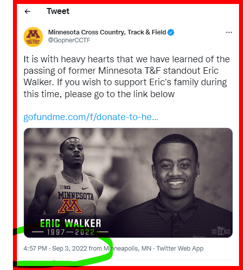September 4, 2022 Former Gophers track star Eric Walker killed in crash at 25 his death was announced on Sept 3 GIVE KNOWLEDGE AND SHARE THIS! Click to share on Facebook (Opens in new window) Facebook Click to share on Telegram (Opens in new window) Telegram Click to share on X (Opens in new window) X Like Loading... Related