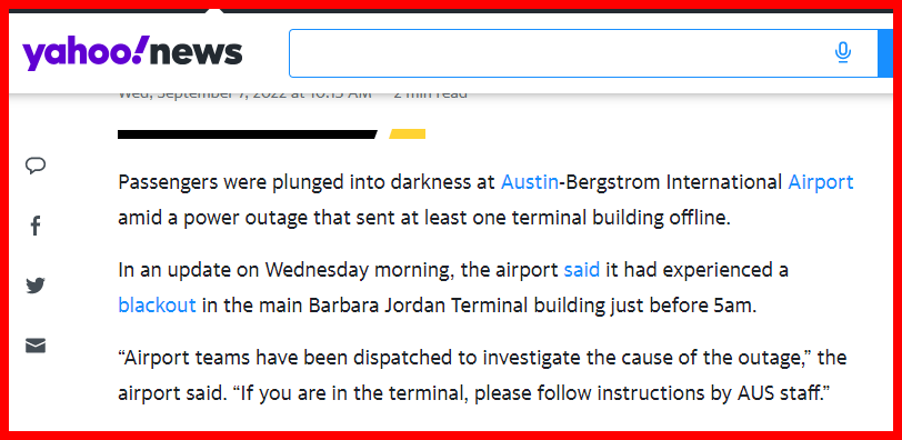 September 7, 2022 I spy a 201. Blackout shuts down Austin-Bergstrom International airport GIVE KNOWLEDGE AND SHARE THIS! Click to share on Facebook (Opens in new window) Facebook Click to share on Telegram (Opens in new window) Telegram Click to share on X (Opens in new window) X Like Loading... Related