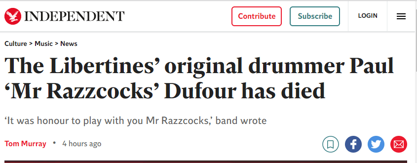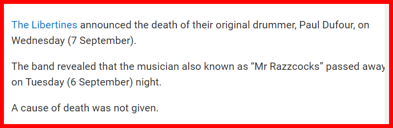 September 7, 2022 The Libertines announced the death of their original drummer, Paul Dufour, on Wednesday (7 September). he was kicked out the band for being to old on 10/1/2001 and dead 251 months later GIVE KNOWLEDGE AND SHARE THIS! Click to share on Facebook (Opens in new window) Facebook Click to share on Telegram (Opens in new window) Telegram Click to share on X (Opens in new window) X Like Loading... Related