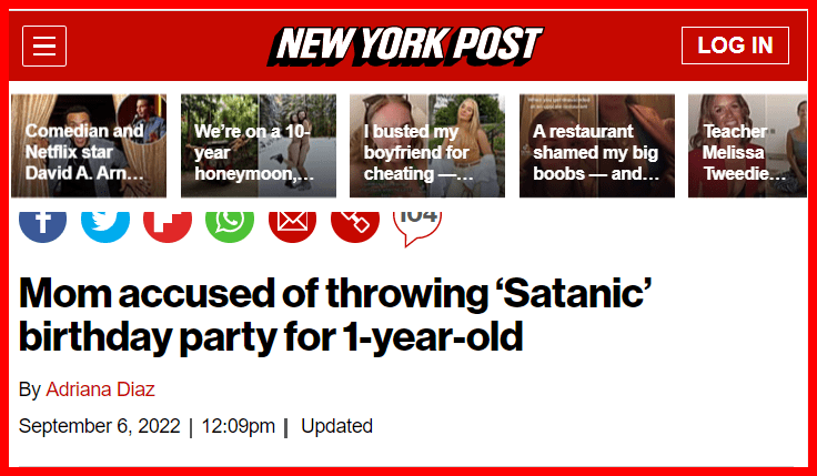 September 8, 2022September 8, 2022 I SPY ANOTHER 201…Mom accused of throwing ‘Satanic’ birthday party for 1-year-old 9/6 GIVE KNOWLEDGE AND SHARE THIS! Click to share on Facebook (Opens in new window) Facebook Click to share on Telegram (Opens in new window) Telegram Click to share on X (Opens in new window) X Like Loading... Related