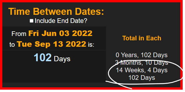 102 days is 14 weeks and 4 days like 144