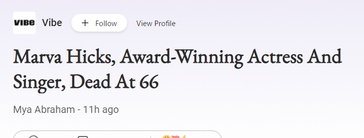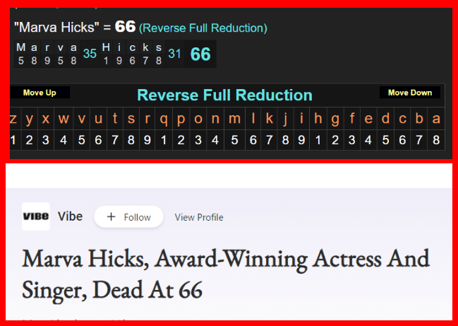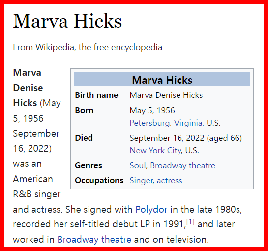 September 20, 2022 Marva Hicks, dead at 66, modern day Sacrifice. dead in new york exactly 33 weeks before her birthday Wikipedia says she performed for Michael Jackson on July 16th 1996 GIVE KNOWLEDGE AND SHARE THIS! Click to share on Facebook (Opens in new window) Facebook Click to share on Telegram (Opens in new window) Telegram Click to share on X (Opens in new window) X Like Loading... Related