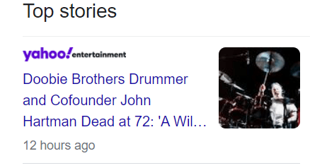 September 23, 2022September 23, 2022 THE DOOBIE BROTHERS JOHN HARTMAN IS DEAD AT AGE 72. A SACRIFICE FOR FAME. 188 DAYS AFTER HIS BIRTHDAY GOT FAMOUS AFTER DOING SATURDAY NIGHT LIVE IN 78′ AND PREFORMING “HEY bARTENDER” GIVE KNOWLEDGE AND SHARE THIS! Click to share on Facebook (Opens in new window) Facebook Click to share on Telegram (Opens in new window) Telegram Click to share on X (Opens in new window) X Like Loading... Related