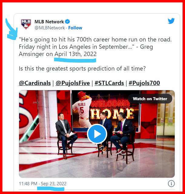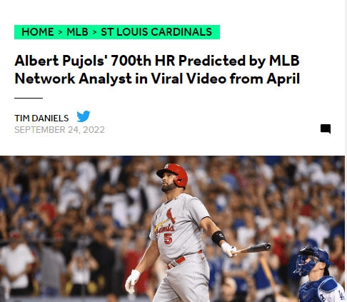 September 24, 2022September 24, 2022 Albert Pujols’ 700th HR Predicted by MLB Network Analyst in Viral Video from April 174 days after his debut anniversary he joins the 700 club DID HE SELL HIS SOUL? GIVE KNOWLEDGE AND SHARE THIS! Click to share on Facebook (Opens in new window) Facebook Click to share on Telegram (Opens in new window) Telegram Click to share on X (Opens in new window) X Like Loading... Related