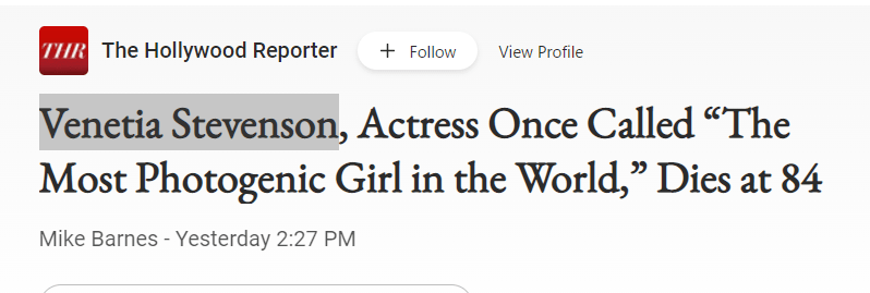September 28, 2022September 28, 2022 Venetia Stevenson, Actress Once Called “The Most Photogenic Girl in the World,” Dies at 84 and 201 days after her birthday DEAD AT AGE 84 AND 201 DAYS AFTER HER BIRTHDAY GIVE KNOWLEDGE AND SHARE THIS! Click to share on Facebook (Opens in new window) Facebook Click to share on Telegram (Opens in new window) Telegram Click to share on X (Opens in new window) X Like Loading... Related