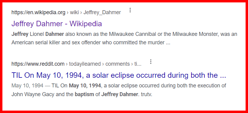 October 2, 2022October 2, 2022 May 10th, 1994, Dahmer is Baptized, The Killer Clown is executed and there was a Solar Eclipse. The 130th Day of the year. Human Sacrifice = 130. 33 counts of Murder They executed Gacy 55 days after his birthday GIVE KNOWLEDGE AND SHARE THIS! Click to share on Facebook (Opens in new window) Facebook Click to share on Telegram (Opens in new window) Telegram Click to share on X (Opens in new window) X Like Loading... Related
