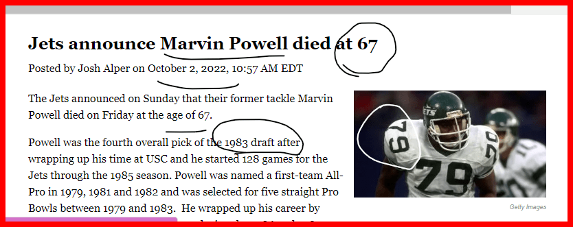 The Jets announced on Sunday that their former tackle Marvin Powell died on Friday at the age of 67.