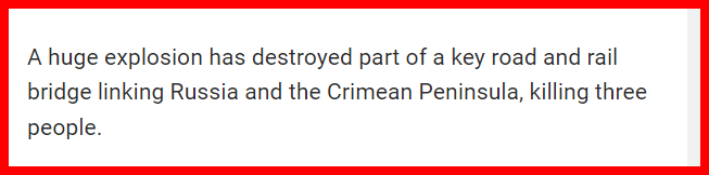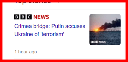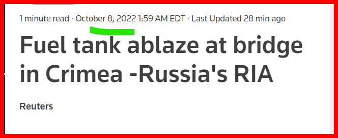 October 8, 2022October 9, 2022 10/8 terrorist headlines …. TRUCK BOMB update on 10/9. Putin blames Terrorism 🙂 GIVE KNOWLEDGE AND SHARE THIS! Click to share on Facebook (Opens in new window) Facebook Click to share on Telegram (Opens in new window) Telegram Click to share on X (Opens in new window) X Like Loading... Related