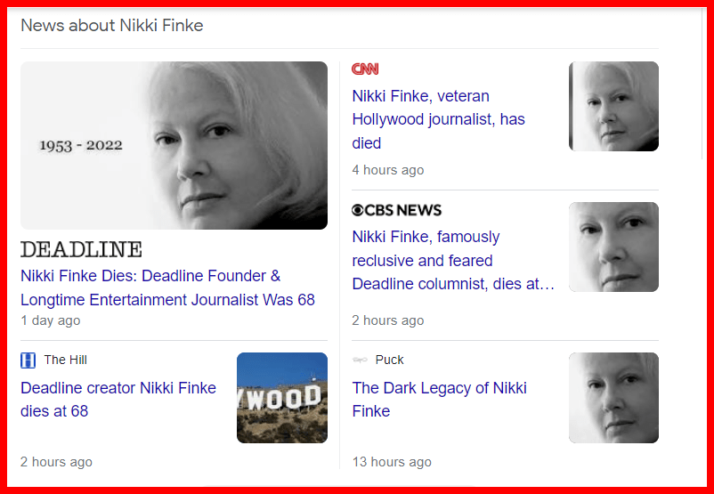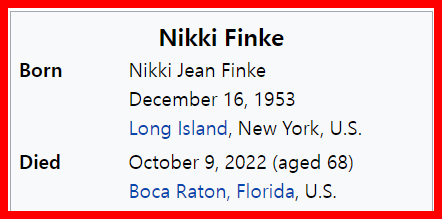 October 10, 2022 Nikki Finke dead age 68 and 68 days before her birthday GIVE KNOWLEDGE AND SHARE THIS! Share on Facebook (Opens in new window) Facebook Share on Telegram (Opens in new window) Telegram Share on X (Opens in new window) X Like Loading... Related