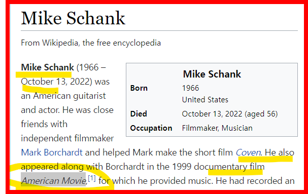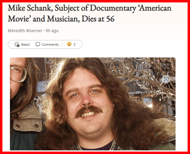 October 14, 2022 Mike Schank, Subject of Documentary ‘American Movie’ and Musician, Dies at 56 GIVE KNOWLEDGE AND SHARE THIS! Click to share on Facebook (Opens in new window) Facebook Click to share on Telegram (Opens in new window) Telegram Click to share on X (Opens in new window) X Like Loading... Related