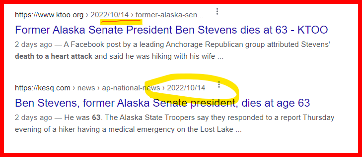 October 16, 2022 Ben Stevens, former Alaska Senate president, dies at age 63 reported dead on 10/14, 211 days after his birthday He died on Oct 13th around 6:40 from Hiking accident.., GIVE KNOWLEDGE AND SHARE THIS! Click to share on Facebook (Opens in new window) Facebook Click to share on Telegram (Opens in new window) Telegram Click to share on X (Opens in new window) X Like Loading... Related