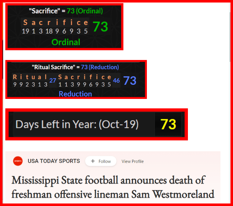 October 19, 2022October 19, 2022 Samuel Westmoreland the chosen sacrifice of the 10/19, the day leaving 73 days in the year. 2022 sacrifice GIVE KNOWLEDGE AND SHARE THIS! Click to share on Facebook (Opens in new window) Facebook Click to share on Telegram (Opens in new window) Telegram Click to share on X (Opens in new window) X Like Loading... Related